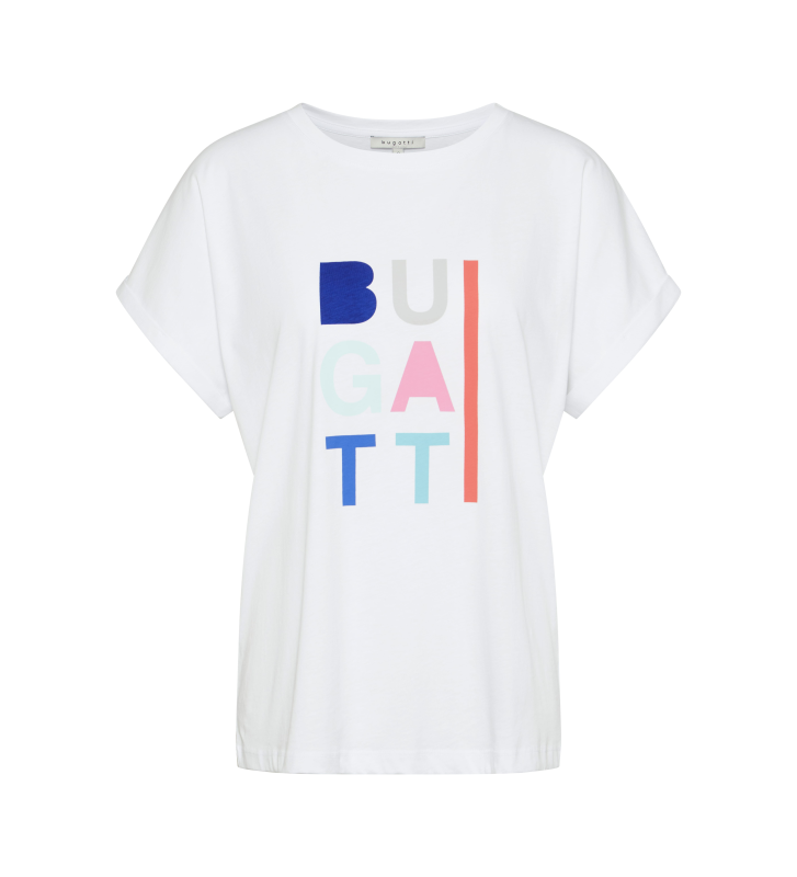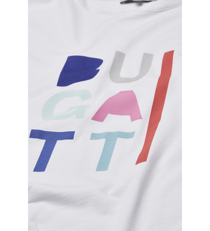 Эта летняя футболка имеет принт с надписью Bugatti.