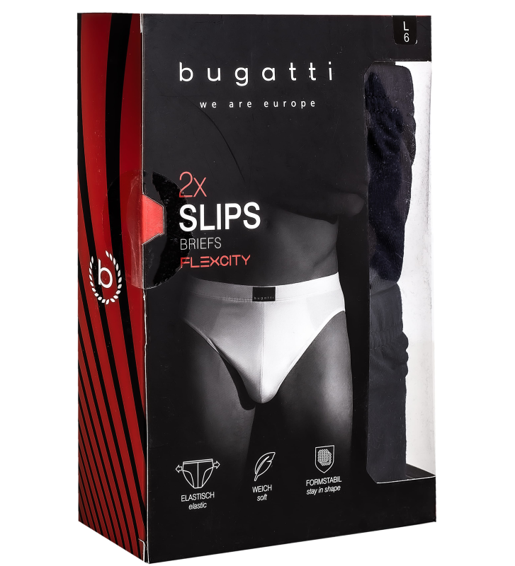 Класичні чоловічі труси-сліпи чорного кольору від bugatti поставляються у практичному комплекті з двох одиниць.