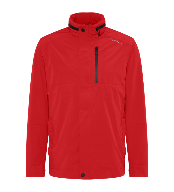 Спортивная куртка с воротником-стойкой, закатанным капюшоном и кокеткой сзади. Прорезные карманы на молнии и нагрудный карман на молнии. Разделительные швы на рукавах, груди и плечах. Куртка имеет полуподкладку, цветные акценты на карманах и окантовку внутри. Модель водонепроницаема и ветронепроницаема благодаря сварным швам и в то же время дышащая. Изделие с функцией растяжения впечатляет своими водонепроницаемыми свойствами благодаря водяному столбу 5000 (5000 мм водного столба), а также не содержит ПФУ.