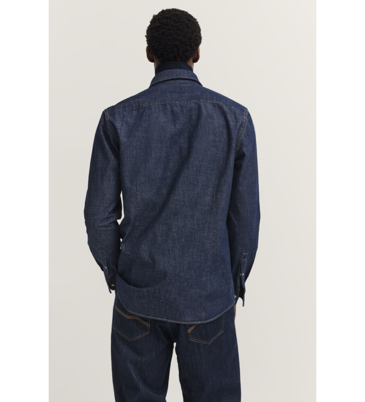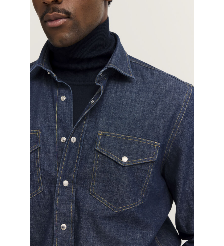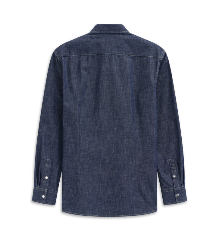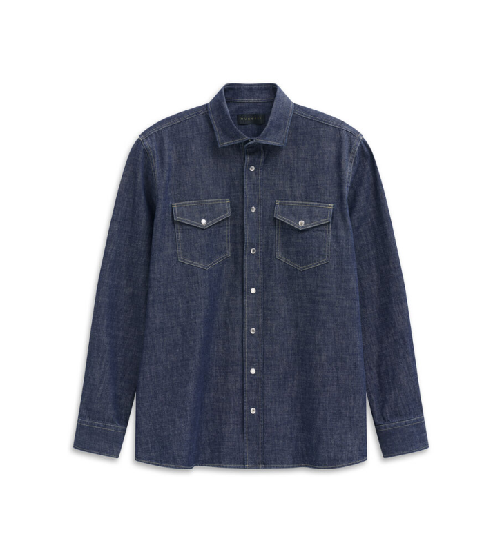 Джинсовая рубашка с воротником Kent, накладными нагрудными карманами с клапанами, кнопками и логотипом Bugatti на боковом шве.