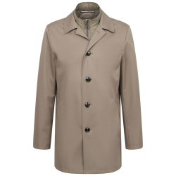 Пальто с отложным воротником и съемной жилеткой. Карманы по шву. Видимая планка на пуговицах и разрез сзади. Однотонная подкладка и внутренние карманы. Изделие впечатляет своей структурой и водоотталкивающим покрытием...