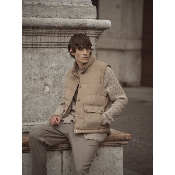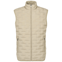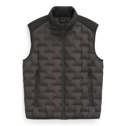 Стеганый мужской жилет оснащен двумя боковыми карманами на молнии.Внешняя ткань поражает своей структурой.Горловина и низ отделаны тканевой резинкой...