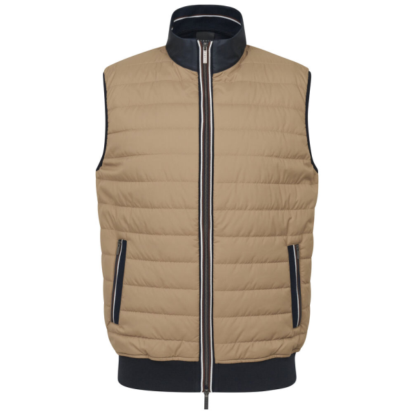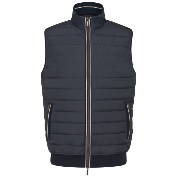 Мужской жилет Bugatti из микса материалов с воротником-стойкой.Жилет имеет прямые боковые карманы на молнии.Не стеганый, а "склеенный" с помощью нового процесса в линейную фантазийную полоску.Водонепроницаемый. ..
