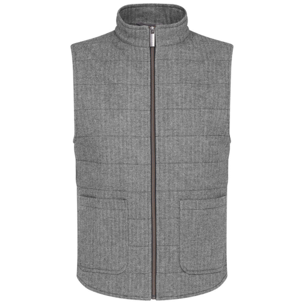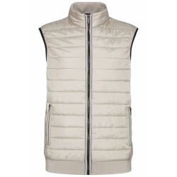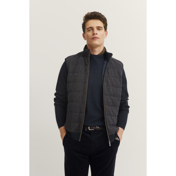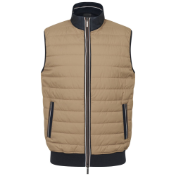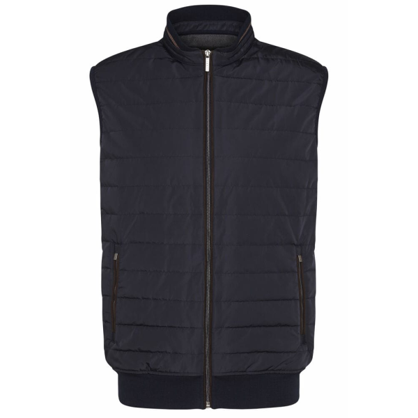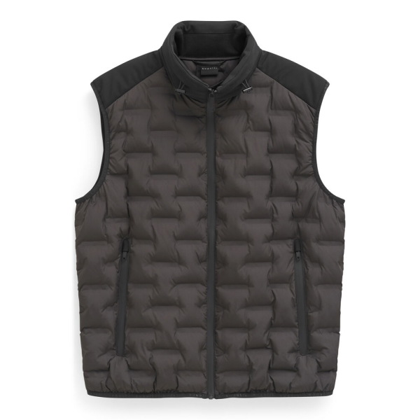 Мужской жилет из ткани, похожей на ткань для подводного плавания, с добавлением нейлона.Нейлон не стеганный, а "склеенный" с помощью нового процесса в линейную фантазийную полоску.Логотип bugatti на левом боковом шве.Хлопковая смеськарманы на молнииВ..