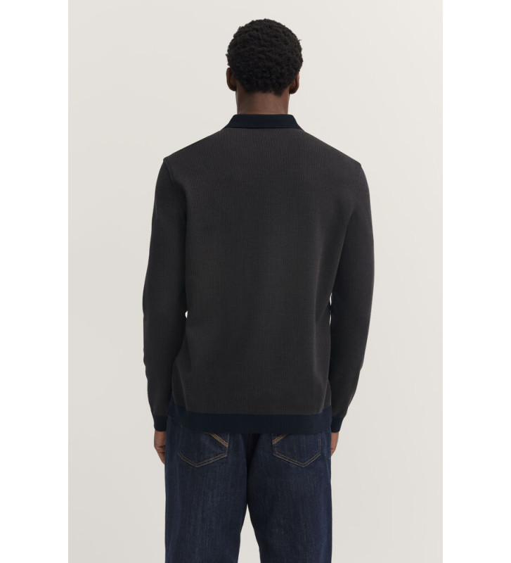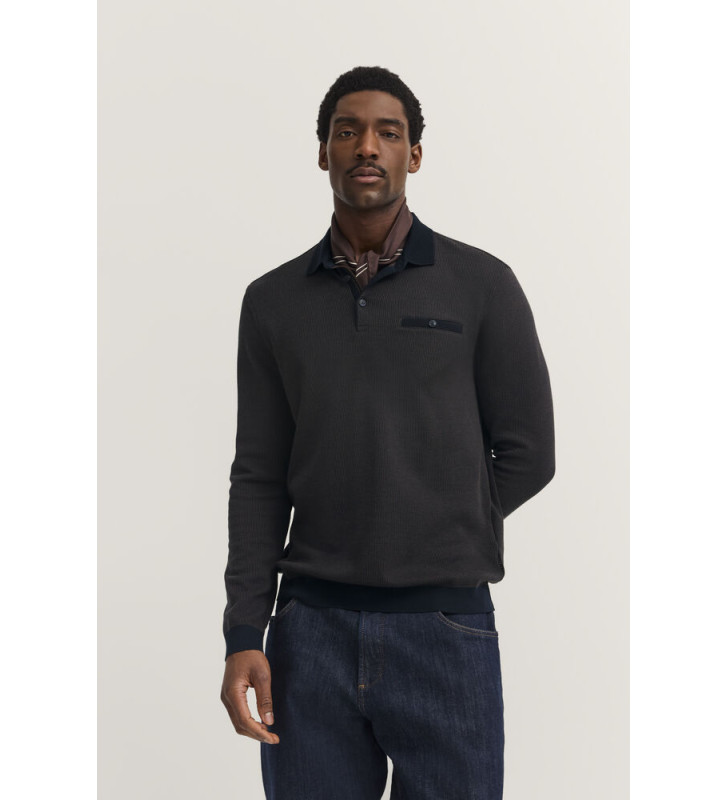 Поло с длинными рукавами, фактурным воротником и нагрудным карманом, также выполненным из фактурной ткани.
