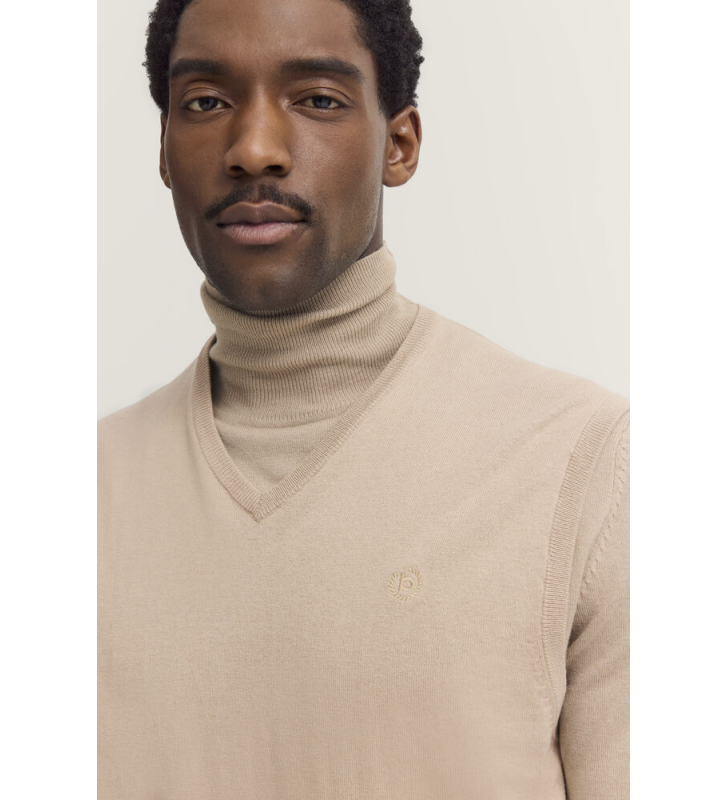 Декольте в форме V придает ему классический характер и делает его идеальным для ношения с рубашкой, гольфом или футболкой.