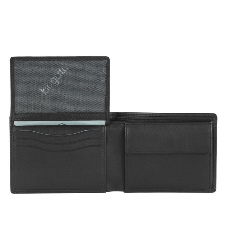 Портмоне Bugatti изготовлено из высококачественной воловьей кожи и представлено в классическом черном цвете.