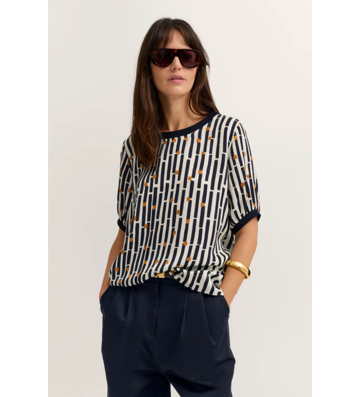 Блузка-рубашка с принтом, современный крой, круглый вырез, темно-синего цвета.