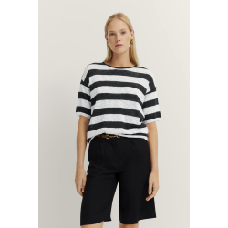 Полосатый свитер бежевого цвета с круглым вырезом и застежкой на пуговицы.Стандартный крой для комфортной посадкиВязаный свитер с застежкой на пуговицы.Мягкая смесь хлопкаМодный полосатый узор с тонкой текстурой.Короткие рукава для летнего образа..