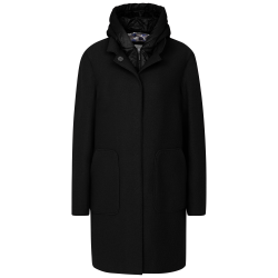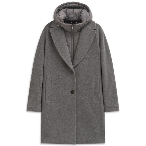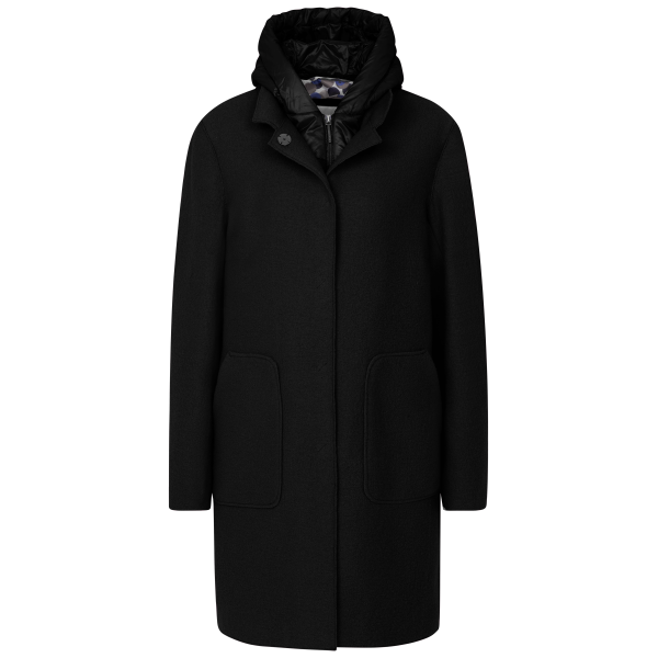 Женское пальто с открытым краем из высококачественной вареной шерсти с небольшим женственным воротником-стойкой и съемным жилетом с капюшоном из нейлона, подобранного по цвету. Удобная подкладка Flexcity также обеспечивает уникальный комфорт при ноше..