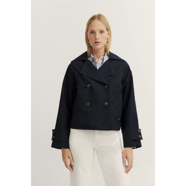 Женский укороченный тренч Bugatti синего цвета.Благодаря водоотталкивающей ткани вы хорошо экипированы для нестабильной погоды.Высококачественная хлопковая смесь обеспечивает комфортную посадку, а двубортный крой с отложным воротником сочетает элеган..
