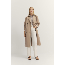 Двубортный женский тренч Bugatti бежевого цвета. Хлопковая модель с широким отложным воротником, застежка на шесть пуговиц, врезные карманы по бокам. Плащ-тренч - всегда актуальная вещь повседневного гардероба...