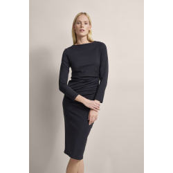 Трикотажное платье с легким воротником-стойкой, заниженной линией плеча и ребристым низом и рукавами...