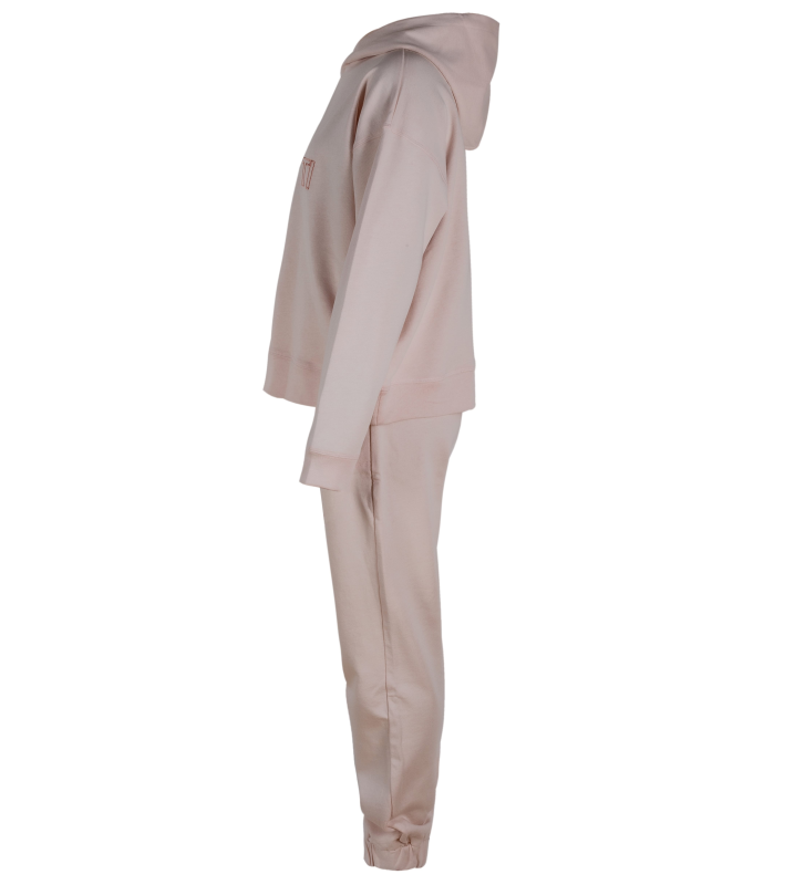 Женский спортивный костюм, который состоит из кофты с капюшоном и карманами-кенгуру и штанами с эластичным поясом на резинке и манжетом.
