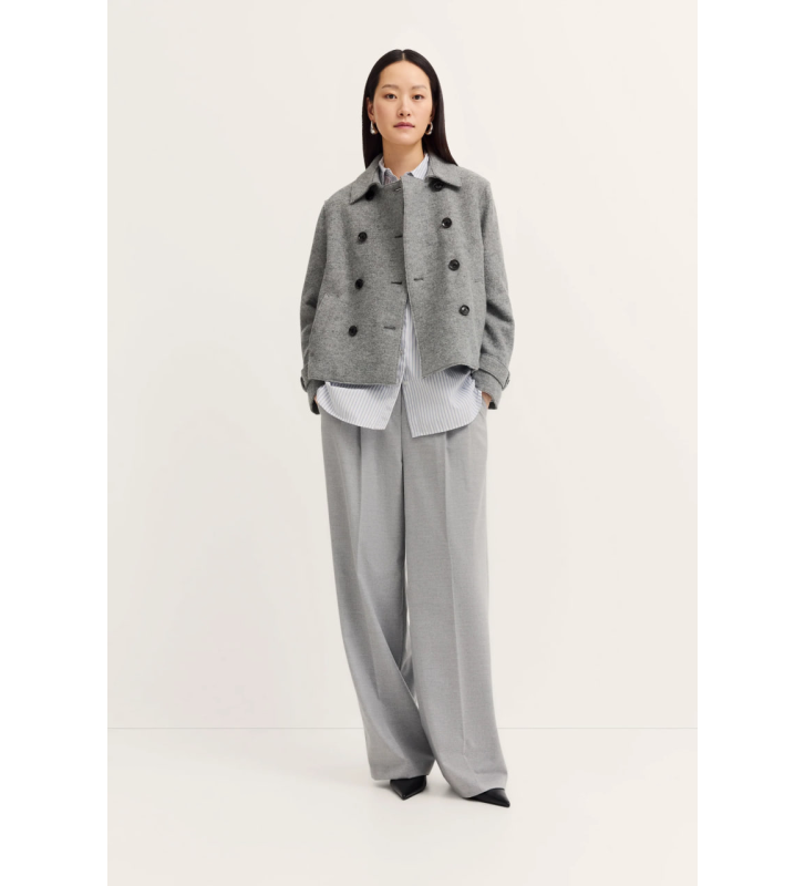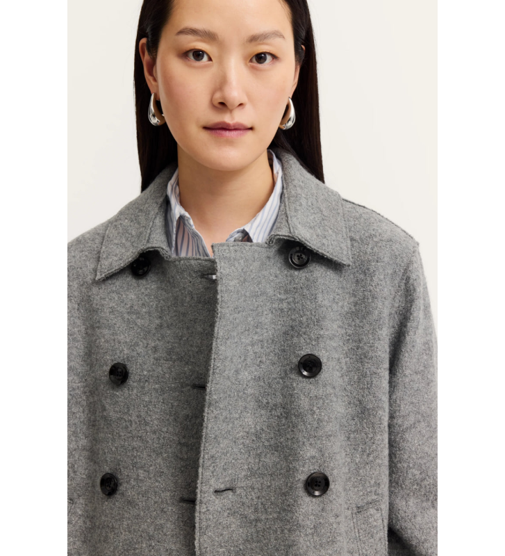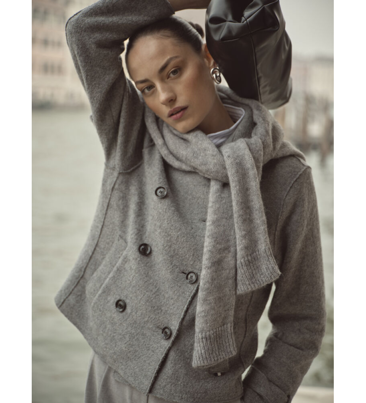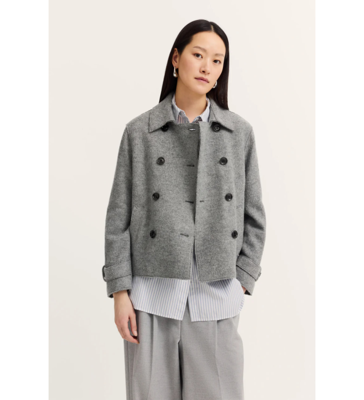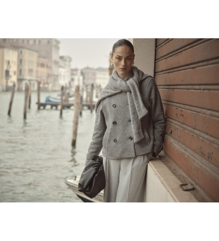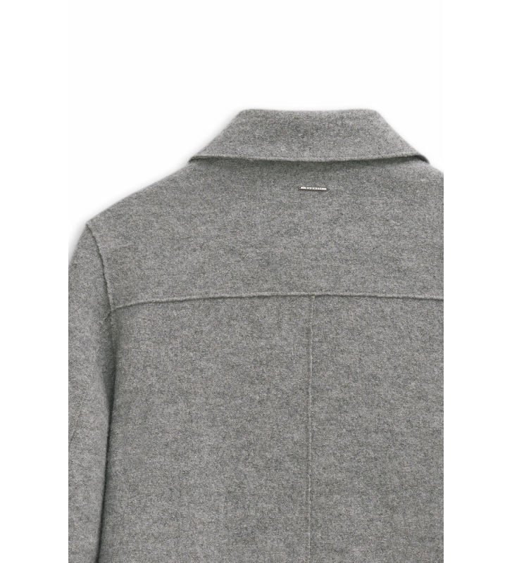 - Двухрядная застежка на пуговицах, элегантные открытые швы.