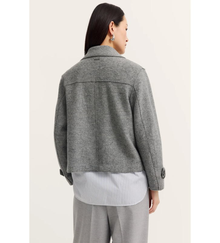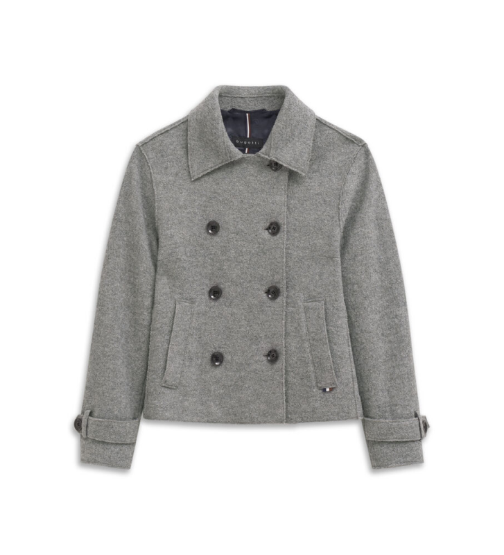 Женский жакет Bugatti, изготовленный из вареной шерсти со стрейчем, свободного кроя, с открытыми краями, темно-серого цвета.