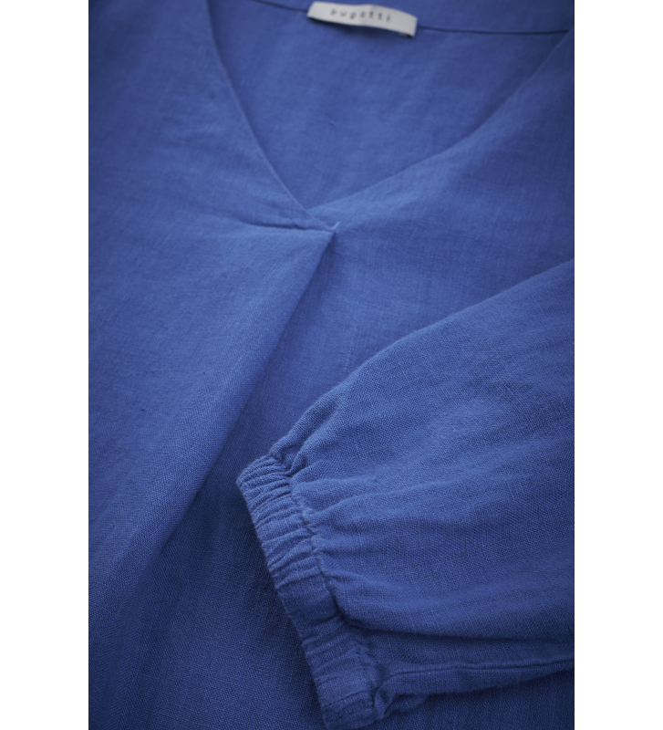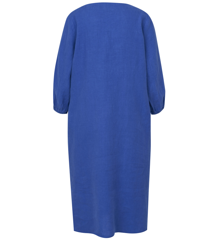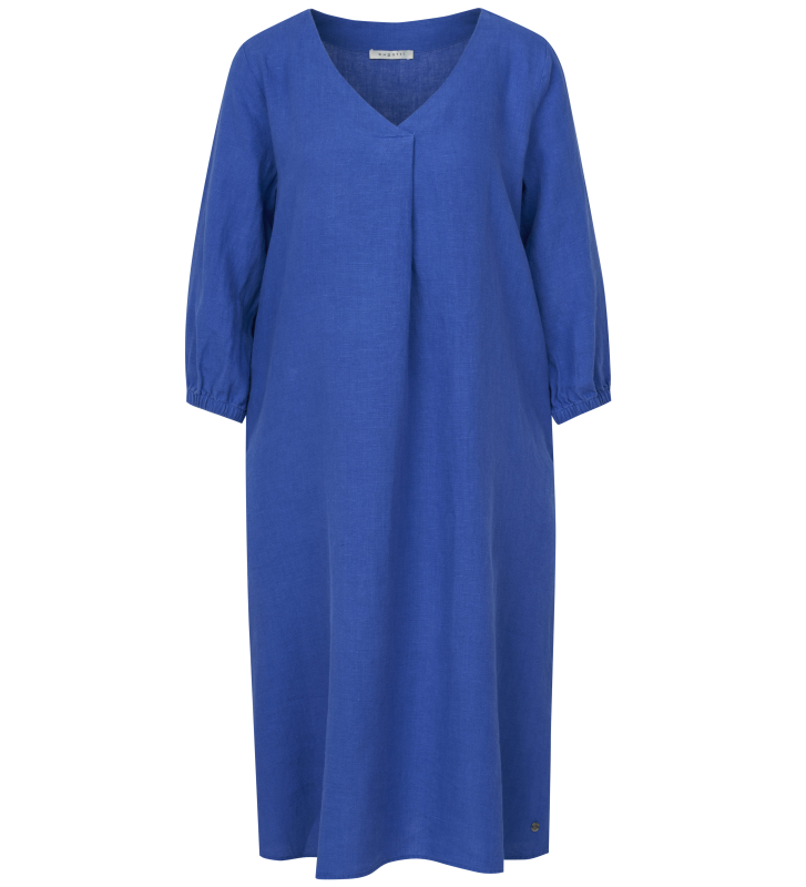 Льняное платье с укороченными рукавами, V-образным вырезом и складками спереди.