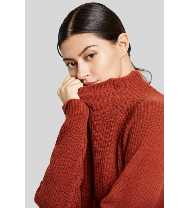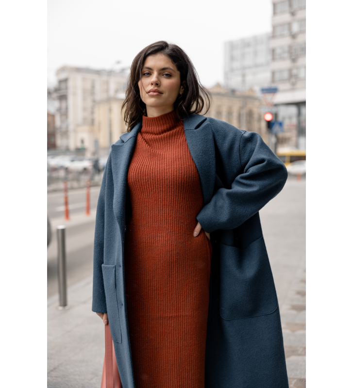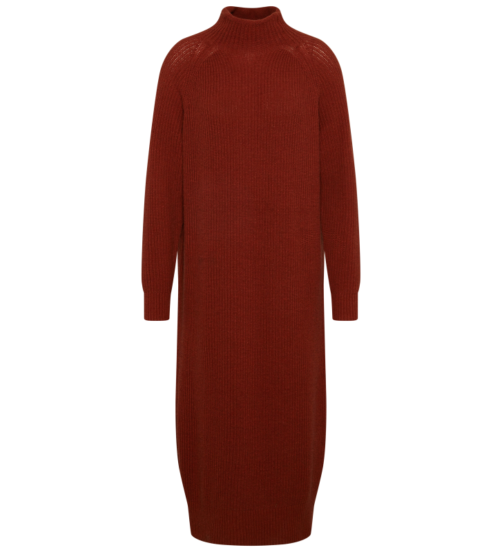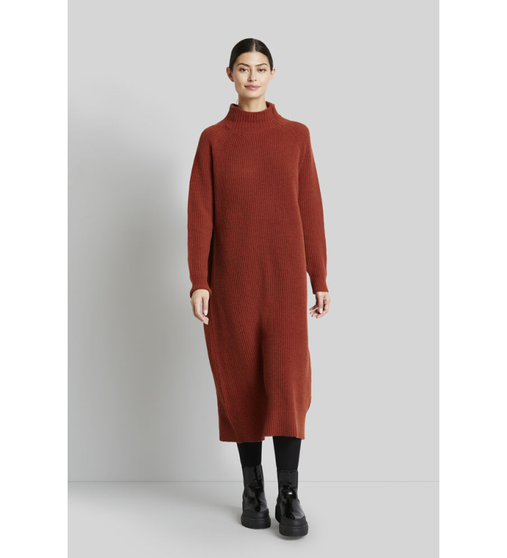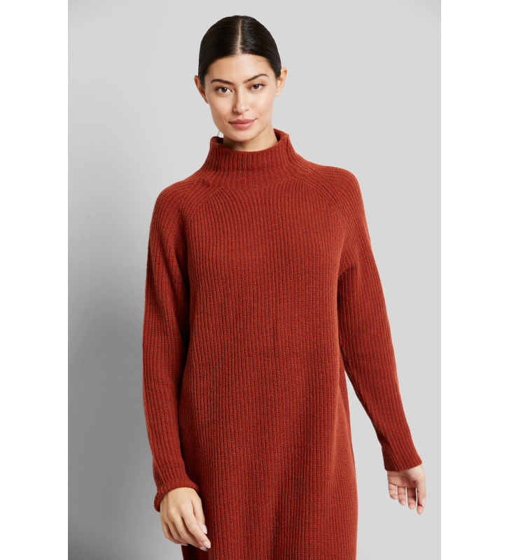 Трикотажное платье с легким воротником-стойкой, заниженной линией плеча и ребристым низом и рукавами.